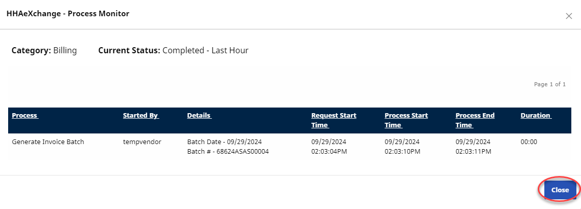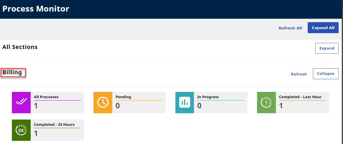 (Optional) Navigate to Admin >Process Monitor to view the progress of the submission. Expand the Billing section to view. The file can either be in Pending or Completed status.