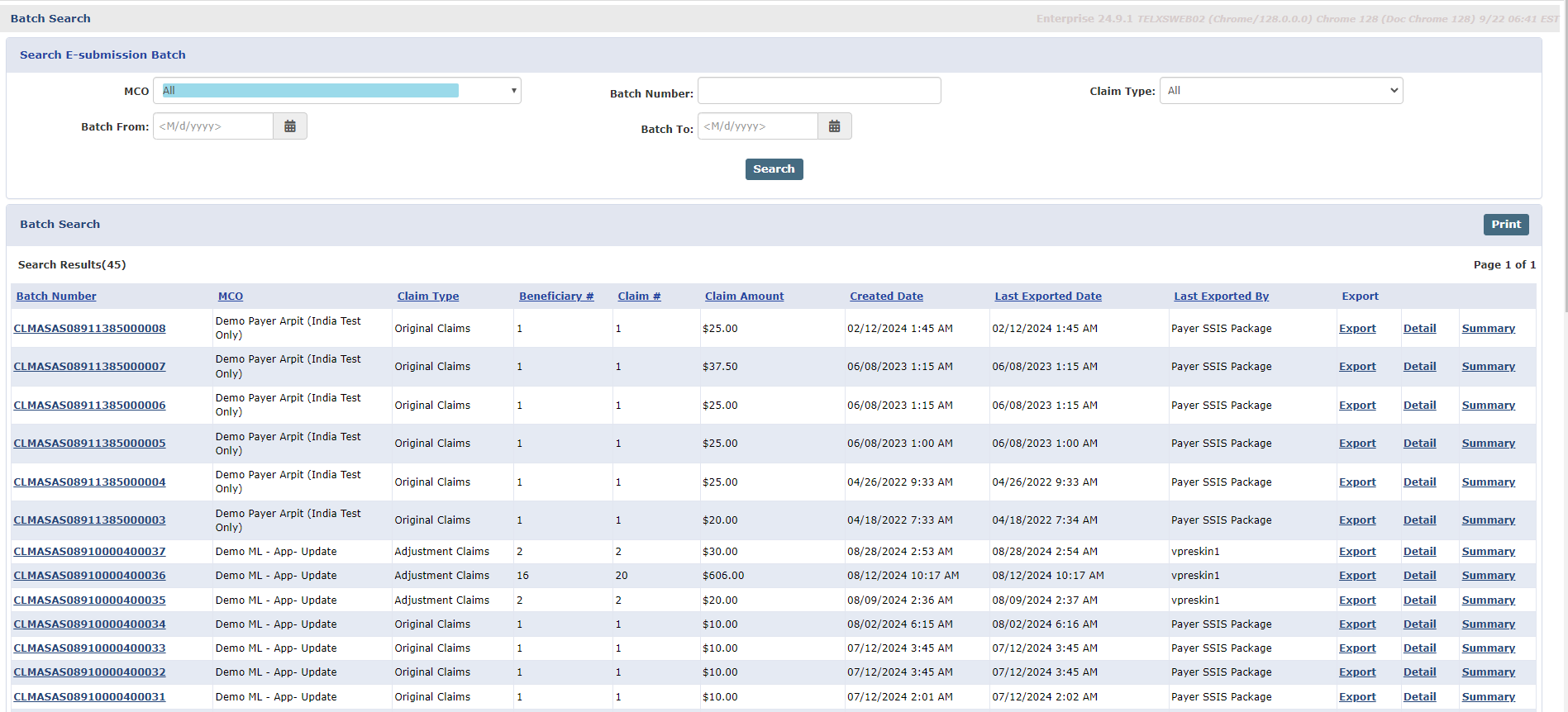 The search results display the claims batches with information such as the Batch Number, the Contract, Claim Type, Amount, and Dates. Use the Export link to export the claim. Use the Detail and Summary links to download the files.