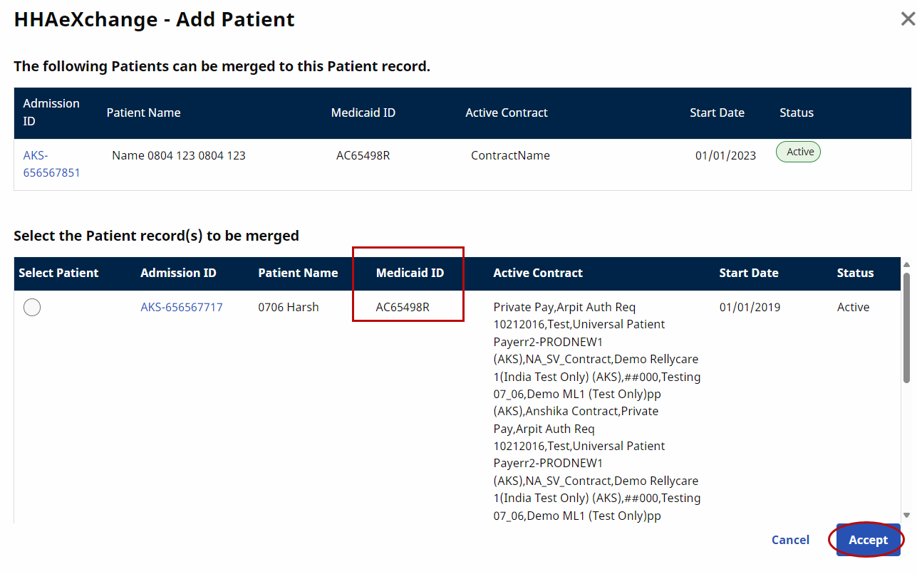 The following image displays the Patient’s Medicaid ID in the Parent record (top) matching to several potential Child records (bottom). Click on the radio button to select the applicable Child record and click on Accept to initiate the merge request.