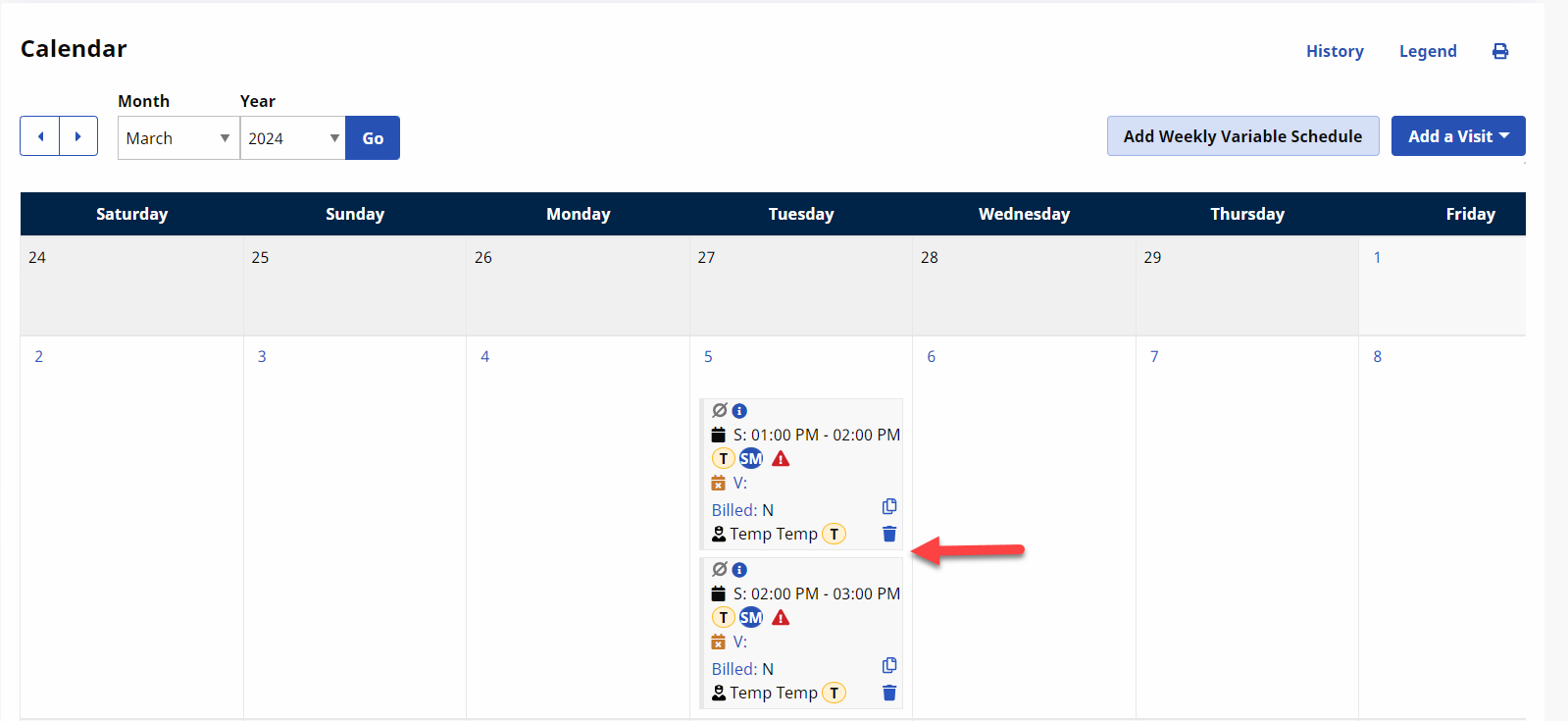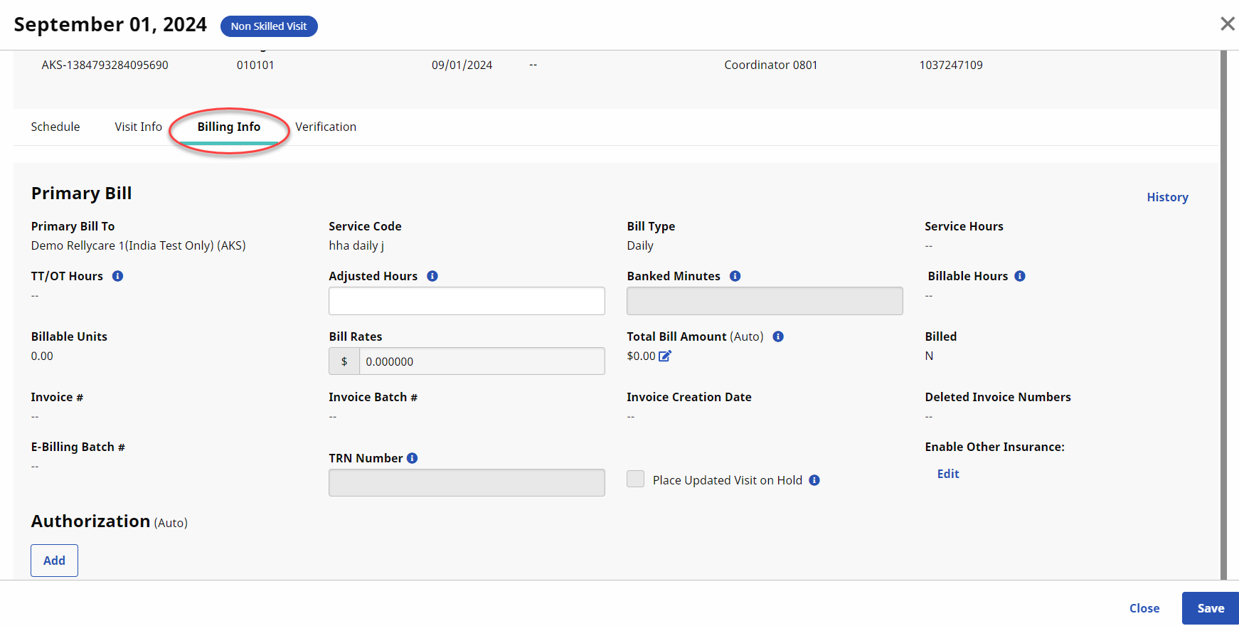 Create and process visits as usual (from scheduling through payroll). Note: Claims are held in Billing Review for TEMP Authorization.