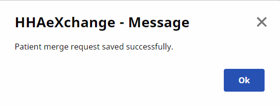 The Patient Merge request is complete. Click OK to continue.