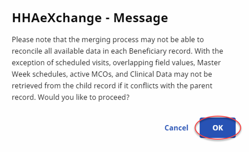 For efficiency purposes, the system allows only one merge request per Patient at a time. One merge must be complete before initiating another.