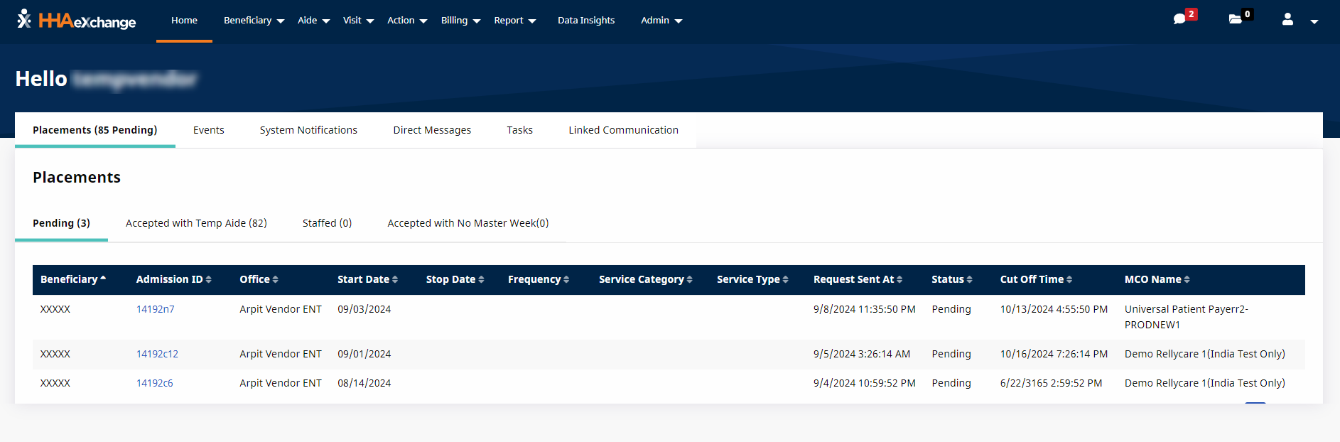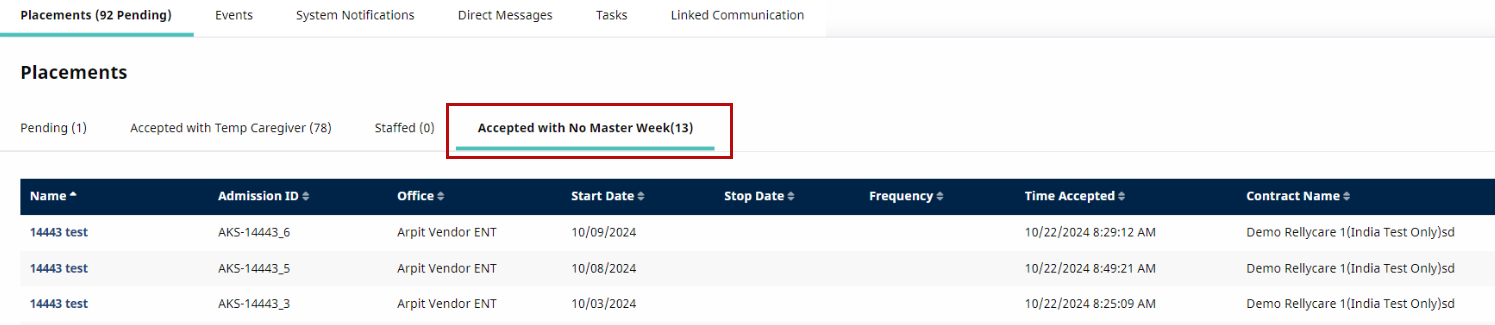 Once the placement is accepted, the Enterprise system creates an internal record (Patient Profile) populating key demographic data received from the Payer system. Allow some time for the placement to process in the system. Once a placement is accepted, it cannot be accepted by another Provider.