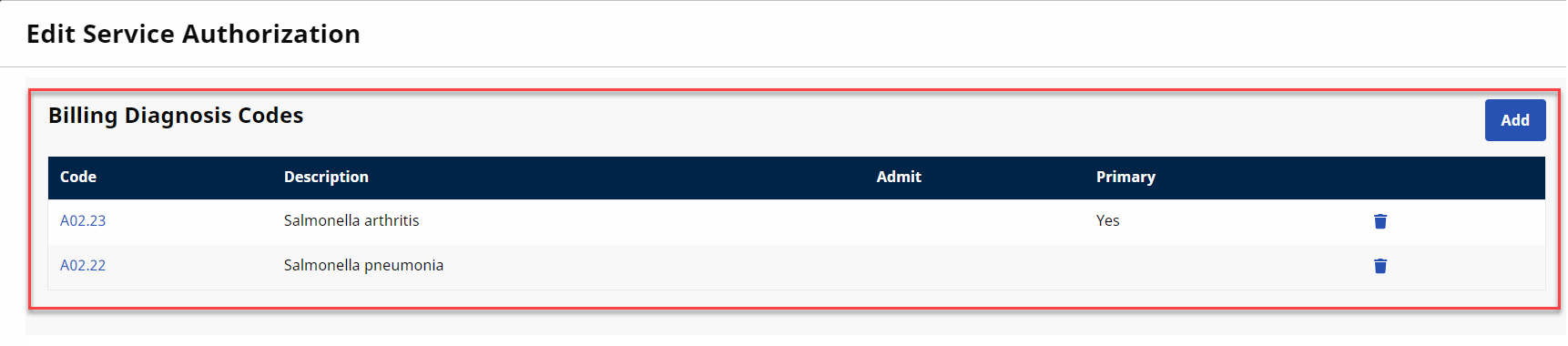 The Diagnosis Codes for an Authorization coming from the Payer are represented as read-only Billing Diagnosis Code fields on the Provider platform.