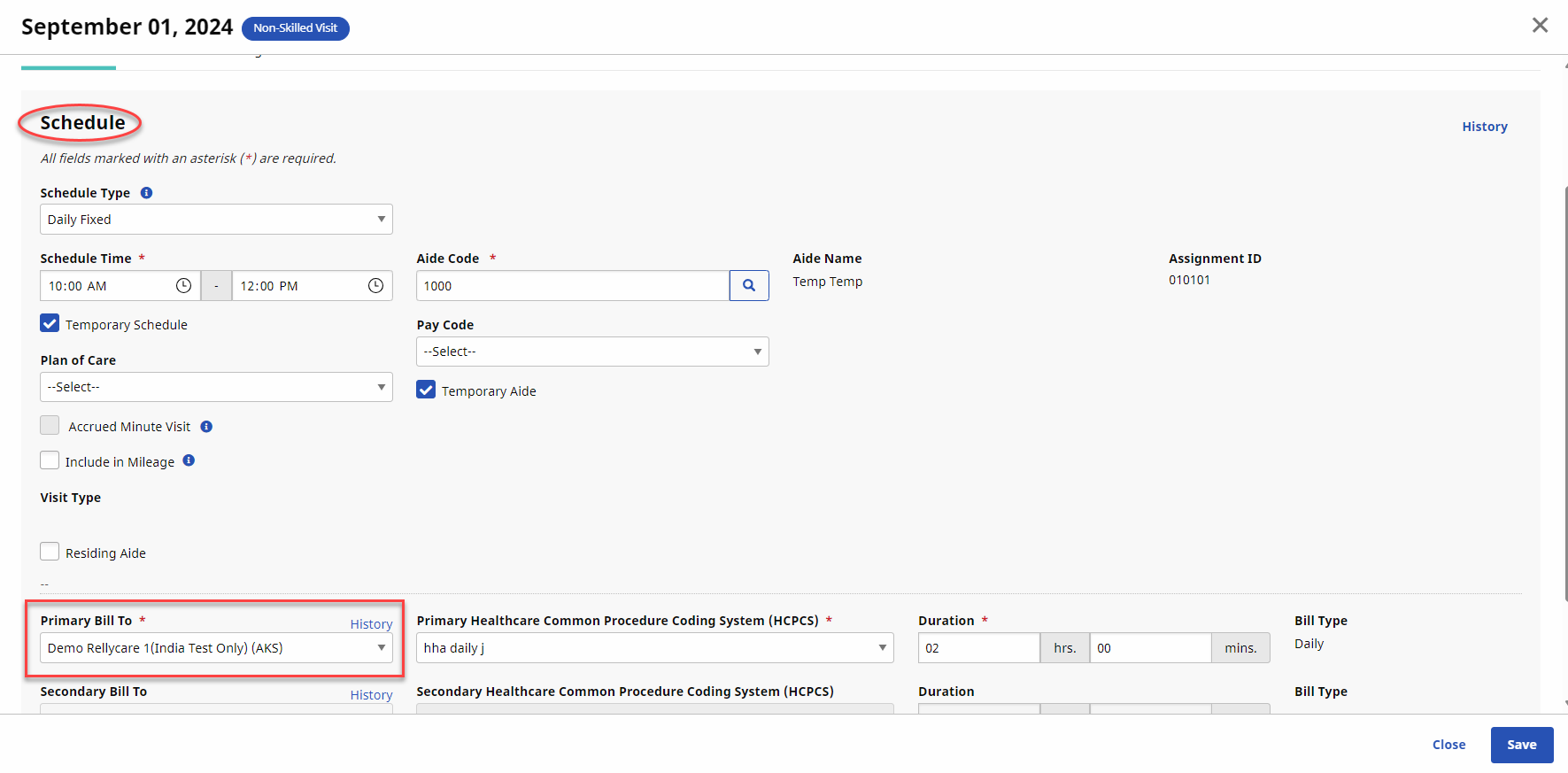 All Contracts (Internal and UPR Linked) appear on the Primary bill to field and can be selected when scheduling a visit on the Schedule tab.