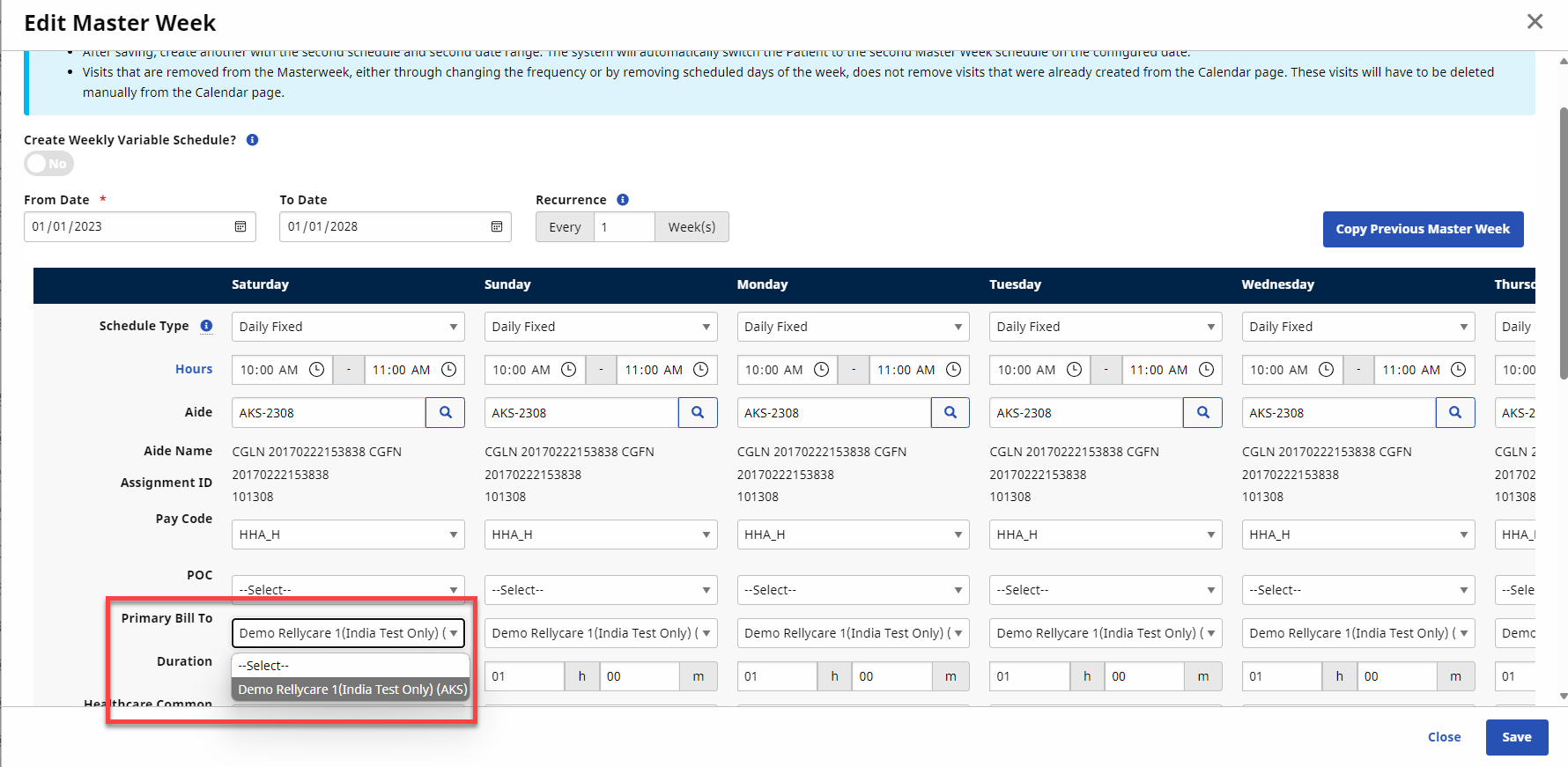 The same applies when scheduling a Master Week. Providers can select Contracts (both Internal and UPR Linked) from the Bill To field interchangeably from one Patient Profile.