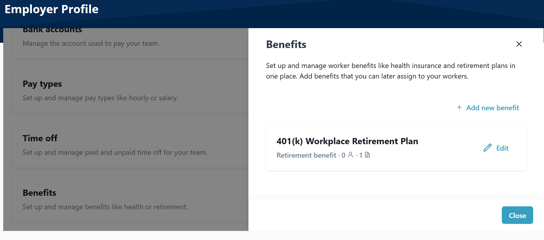 Set up and manage worker benefits like health insurance and retirement plans in one place. Add benefits that you can later assign to your workers.