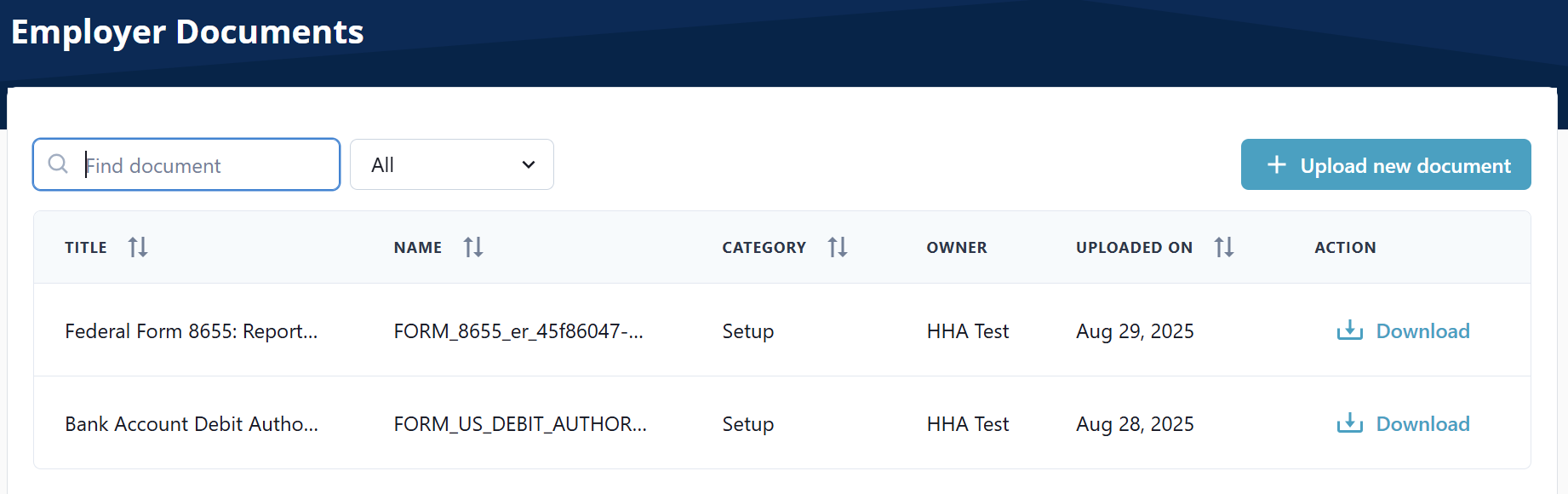 To upload a document, select the Upload new document button. You can search and filter for uploaded documents. To download a document, select Download under the Action column.