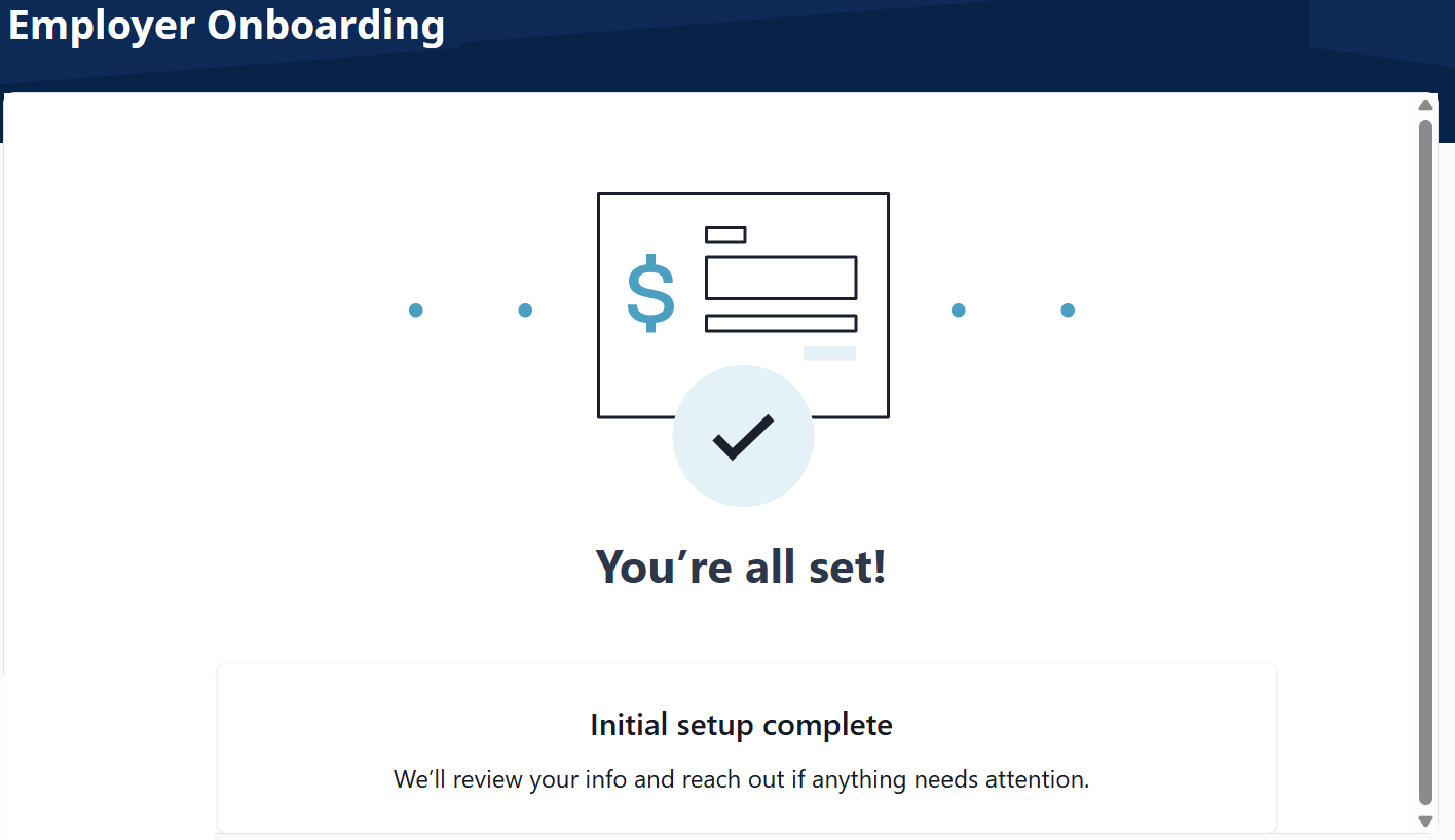 The notification that You're all set! displays after you complete each section on the Employer Onboarding.