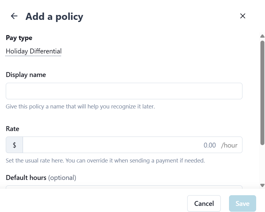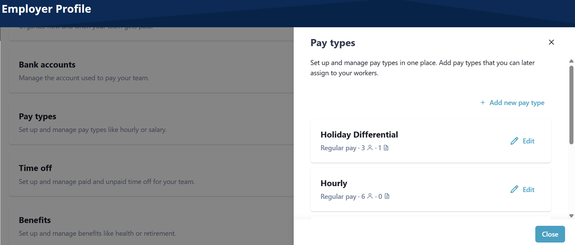 The ability to create custom and default pay types is available for both employees and contractors. This feature allows employers to set up standard pay types like hourly, salary, and reimbursements. It also enables an employer to create custom labels for pay types specific to an individual business' needs.