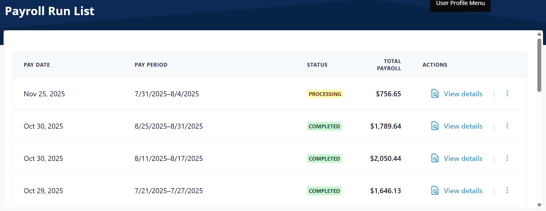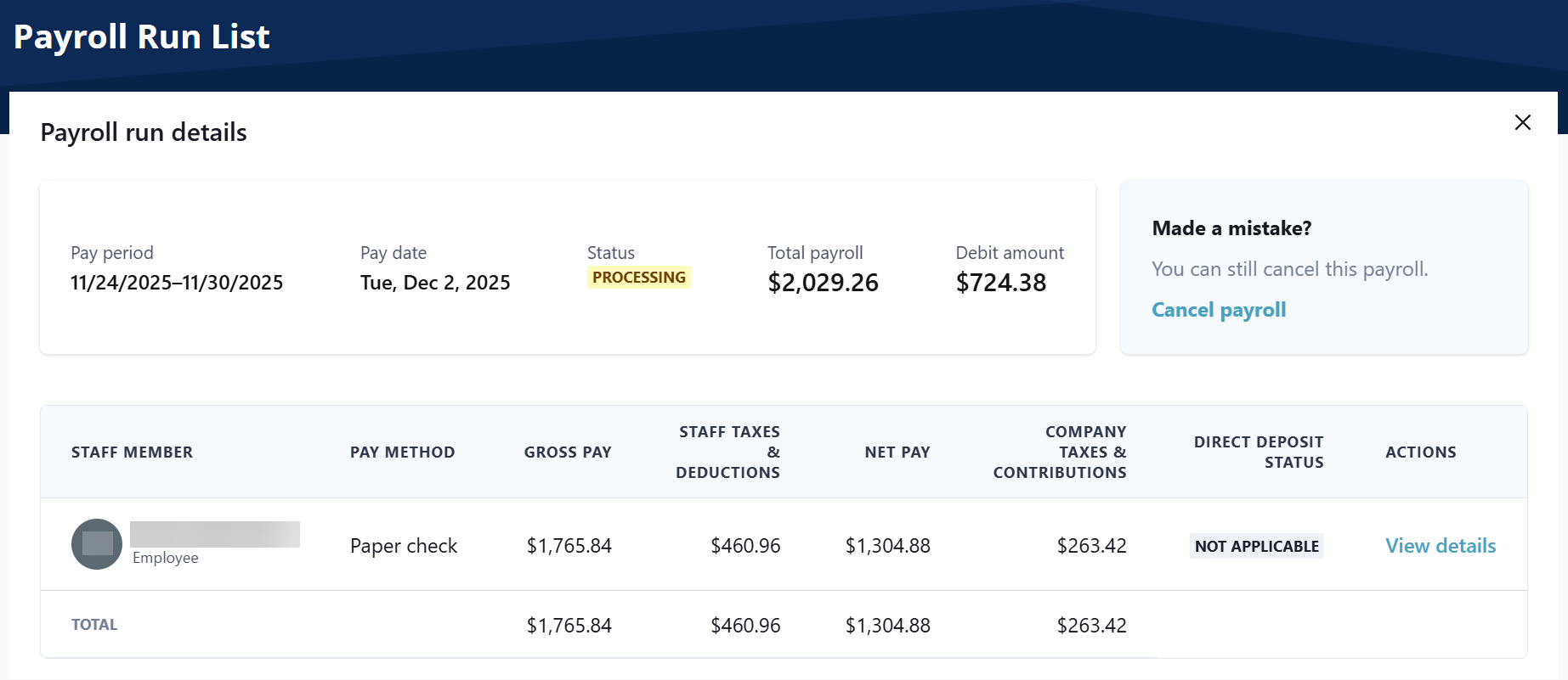 Select View Details to see more details about the Payroll Run. You can cancel the payroll from this screen if you made a mistake.
