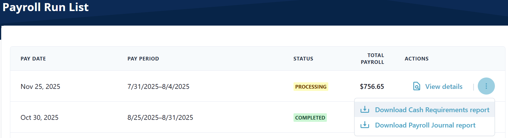 The Payroll Run List feature under Payroll > Employer, allows you to review pending payroll and download payroll reports.