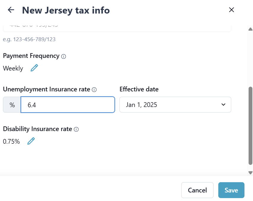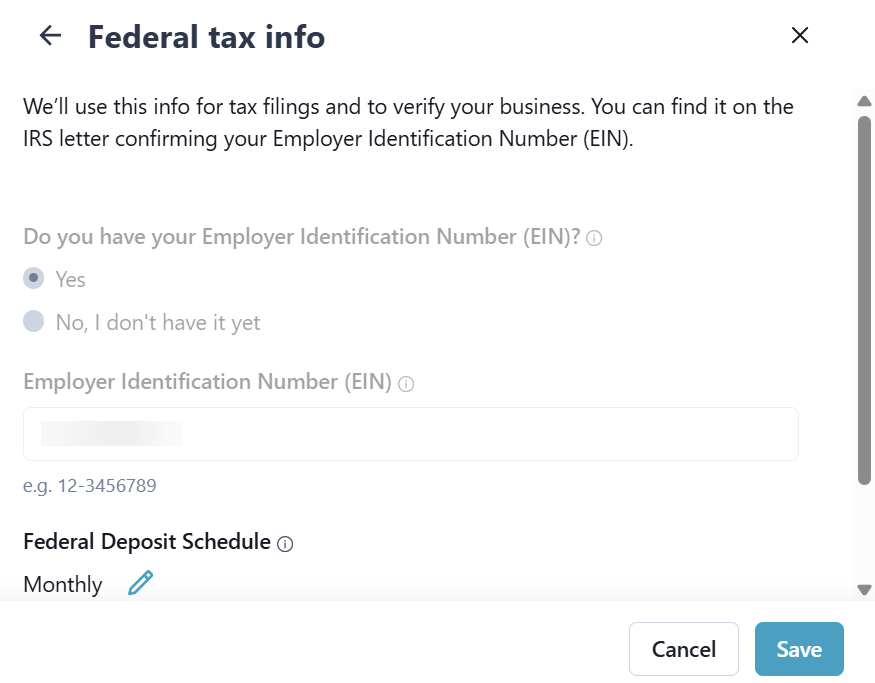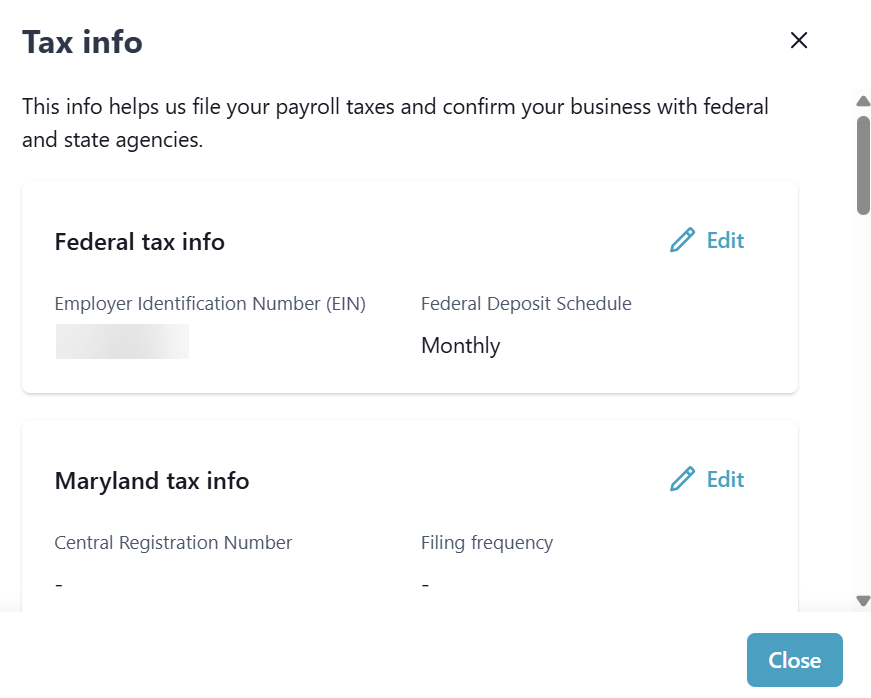 On the Employer Profile select Edit on the Tax info section. The Tax info window opens.