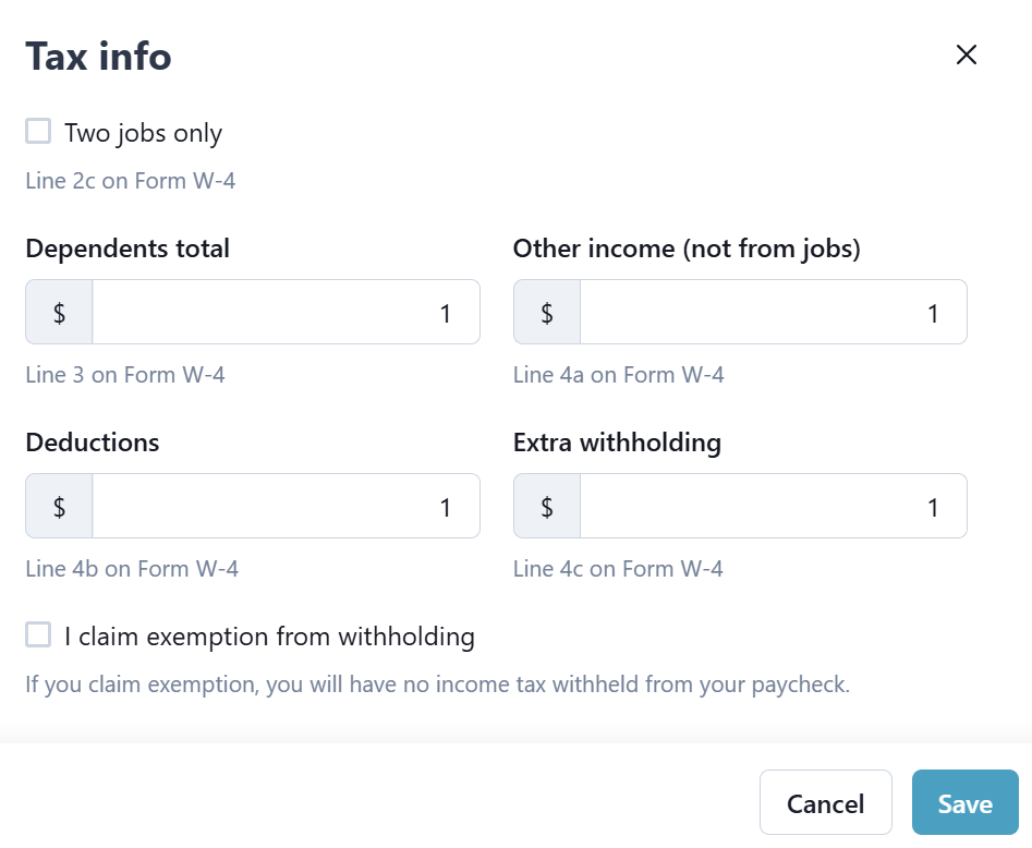 On the Worker Profile select Edit on the Tax info section. The Tax info window opens.