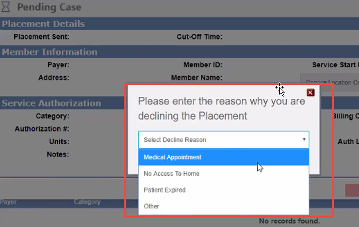 If you decline the case, select a Decline Reason in the pop-up window. The Payer is notified, and the case is returned to them to assign to another Provider.