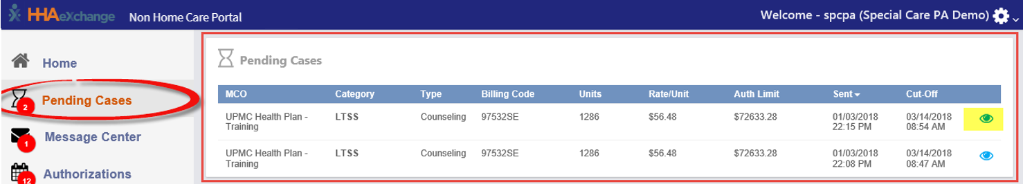 To view a pending case, click the Eye icon next to the case.