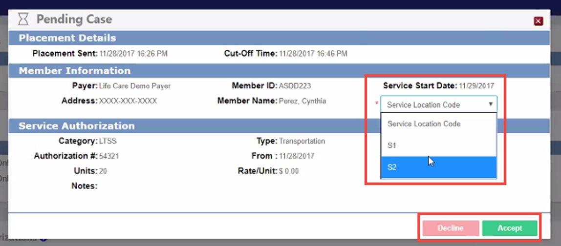 When you open a pending case, the case details are displayed. If required, select a Service Location Code from the dropdown menu. The Service Location Code identifies the office location where the Member receives services and affects how billing information is sent to the Payer. This field is configured by System Administration and is only selectable if required by the Payer.