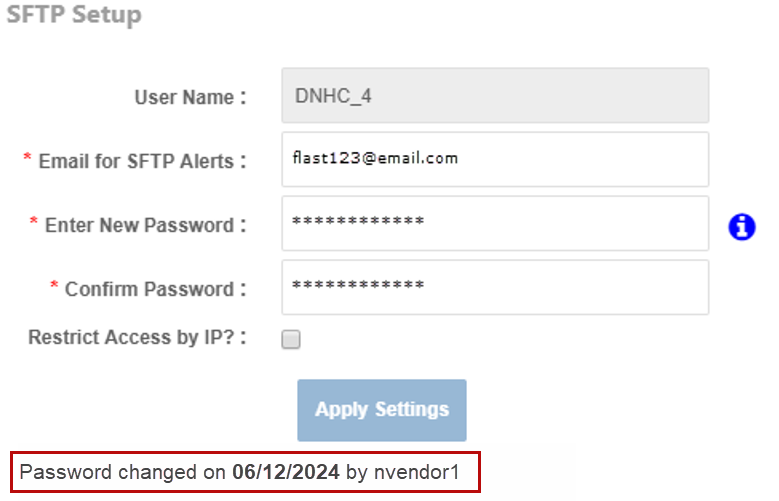 Password: Create and confirm a new SFTP password. Hover over the Info icon to view password requirements.
