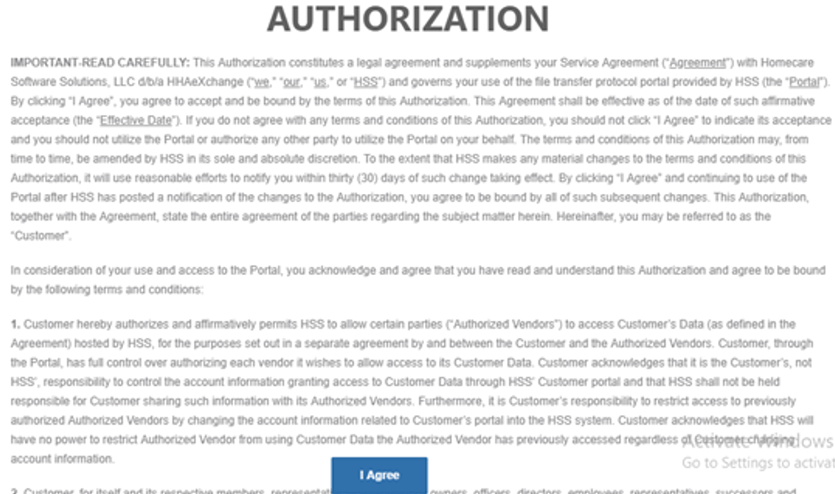 This agreement appears once per Provider at initial login.
