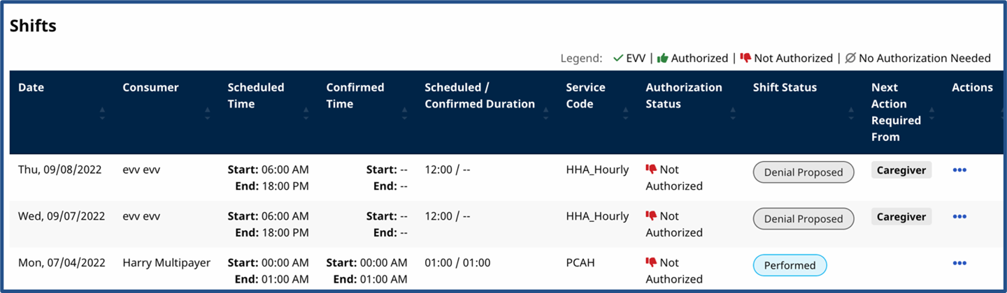 Actual time of the shift as recorded with clock-in and clock-out. If the shift was recorded with EVV, a green EVV checkmark appears near the confirmed time. |