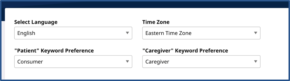 From the System Menu, click System Settings to view and change Services Portal settings. You can select your preferred Language, Time Zone, Patient Keyword Preference, Caregiver Keyword Preference, and Notification Preferences for Email from the Services Portal.