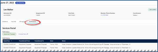 If Share Visit Info with Services Portal is enabled for the related Contract Service Code, then the Shared Services Portal information displays in Services Portal section in the Verification tab for a Patient using Self-Direction services, as seen the image above.