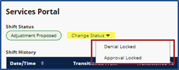(Link) Select Approval Locked or Denial Locked for a shift status. Approval Locked locks an approval for a visit into place and overrides any previous shift status. Denial Locked locks a denial for a visit into place and overrides any previous shift status. Note: If a visit is billed, Approval Locks are not allowed. |