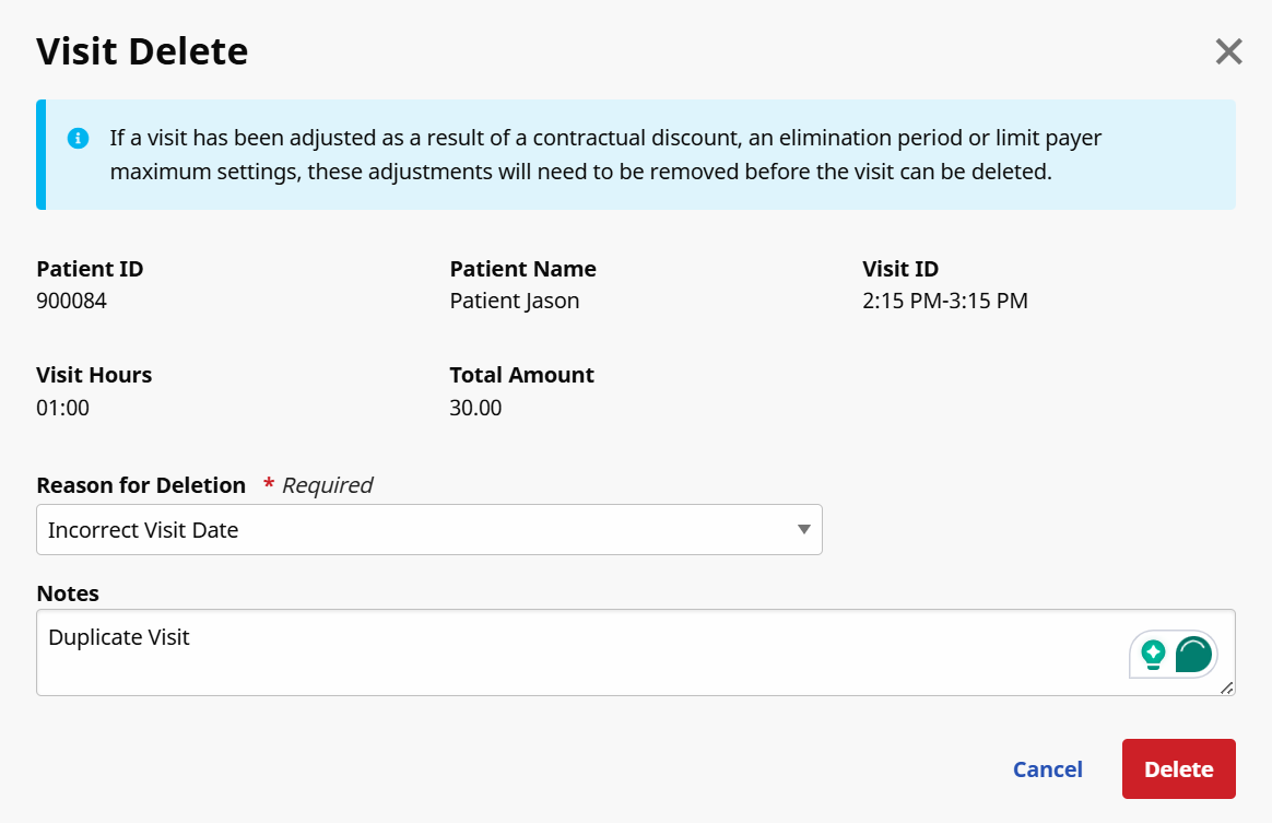 The Visit Delete window appears. Select a Reason for Deletion from the dropdown, and leave a Note if necessary.