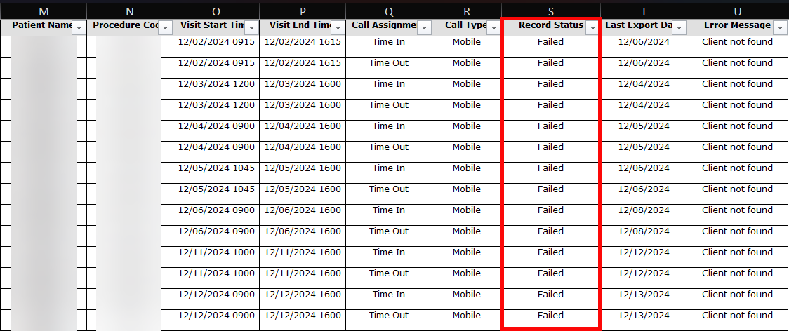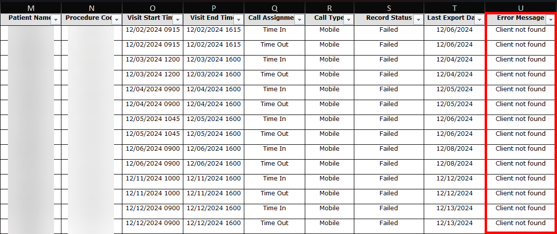 HHAeXchange export issue. Contact HHAeXchange at HHAeXchange EVV Aggregation Support Support to resolve. |