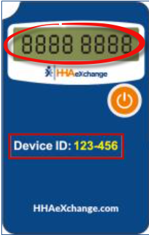 The fixed object (FOB) Device ID is registered directly on the device (shown below). The window provides the digital code the Caregiver enters to clock in and out of the Patient’s home. This digital code changes every 30 seconds.
