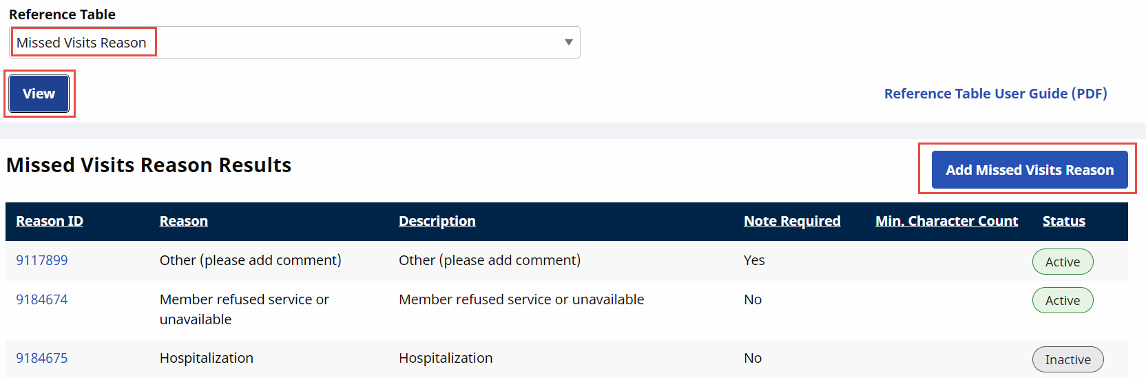 Select Missed Visits Reason from the Reference Table dropdown field.