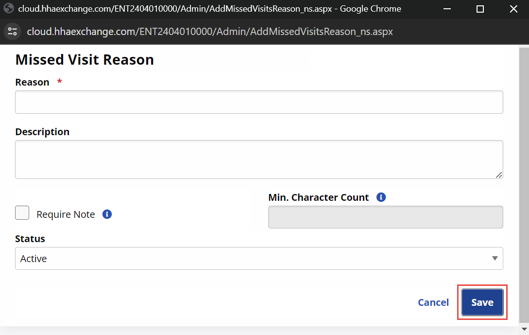 Require Note: Select this checkbox to require a note for the missed visit.