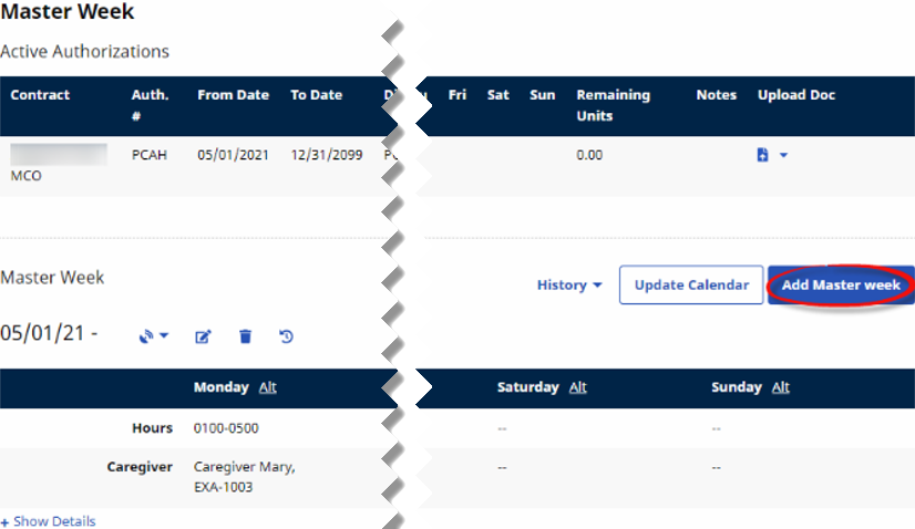 The patient has multiple shifts on the same day. If the patient consistently receives service in the morning and then again in the evening, the agency can add a Master Week for the morning shift and a Master Week for the evening shift.