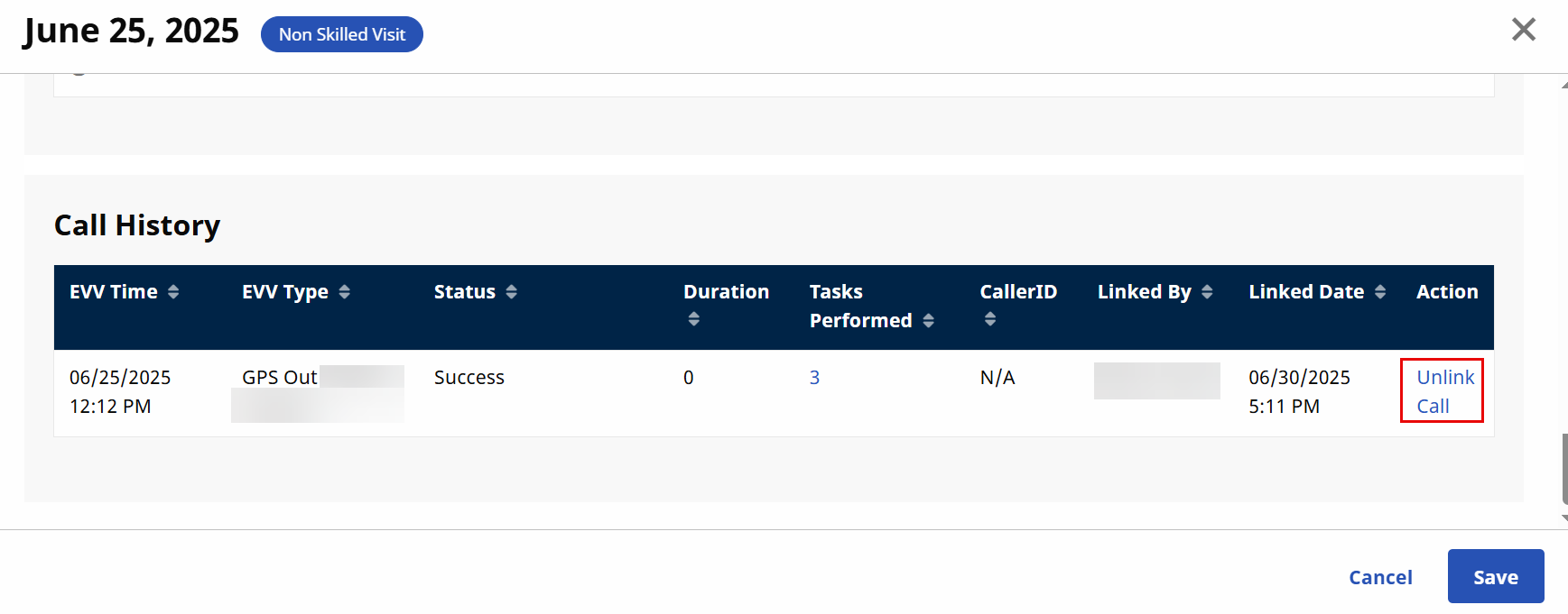 On the Visit Info tab, scroll to the Call History section, select Unlink Call from the Action column, and then select Ok.
