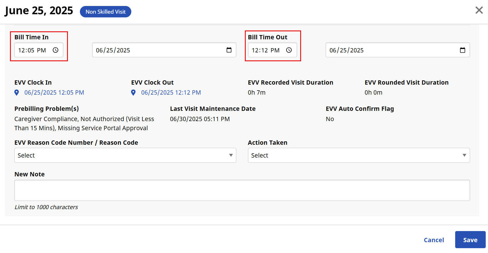 Change the Bill Time In or Bill Time Out for the time that exceeds the documented EVV Time, and then select Save.