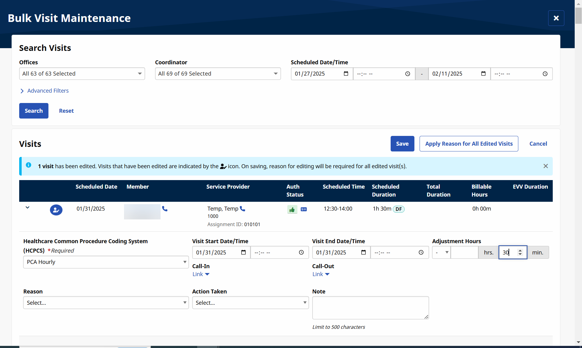 You can edit multiple Visits at a time. Use the Apply Reason For All Edited Visits button to apply the reason entered to all edited Visits.