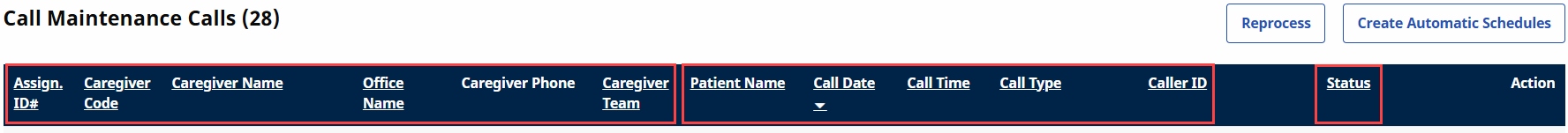 The Call Maintenance tab is a real-time hub for tracking and reviewing Caregiver time and attendance. In this hub, EVV that cannot be matched to a visit is reviewed and held. All EVV held on this tab are assigned a Status that explains why the EVV was held, such as Call from Caregiver Number or Phone Number Not Found. Complete the following steps to review EVV held on the Call Maintenance tab.