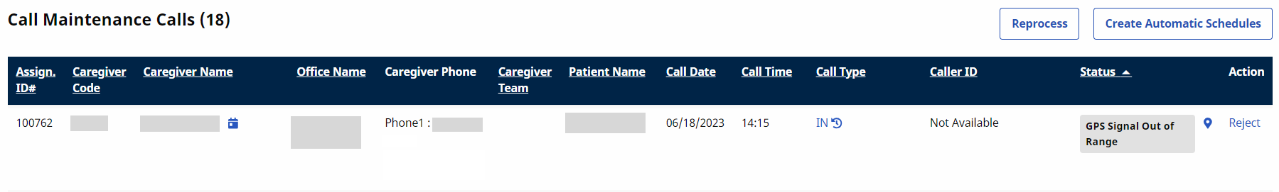 To see a Patient’s Address GPS coordinates in the Call Maintenance tab, click the GPS icon to view the EVV location from any tab of the Call Maintenance tab (such as Rejected Calls).