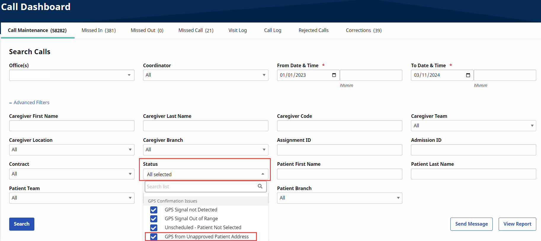 You can search for Multiple Address visits on the Call Maintenance tab by selecting GPS from Unapproved Patient Address under Status.