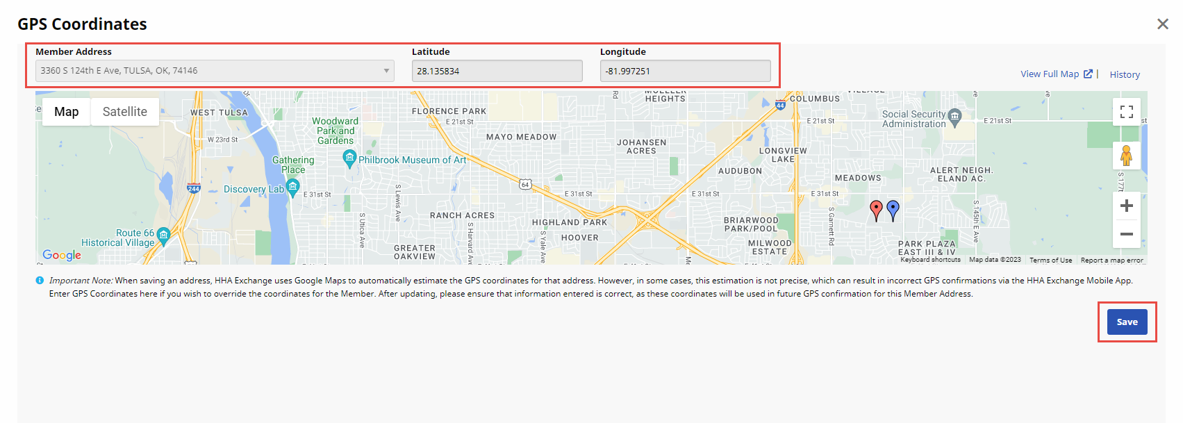 Click Save at lower right to overwrite the Google coordinates with the EVV coordinates.