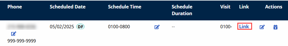 In this example, the visit cannot be linked because the system could not verify the Caller ID. Therefore, there is no way to confirm if the EVV was made from the Patient’s home. Moreover, without a number to save, the Link option does not appear.