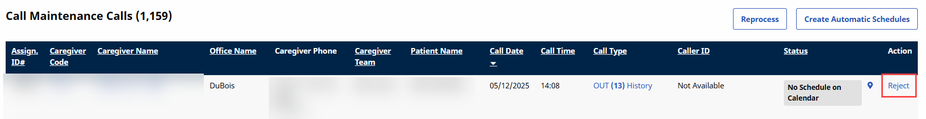 After confirming, the EVV is removed from the Call Maintenance tab and placed on the Rejected Calls tab of the Call Dashboard.
