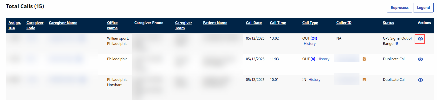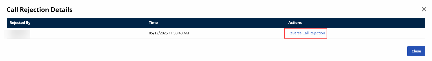 In the search results, locate the call and click the View icon in the Actions column to see Call Rejection Details.