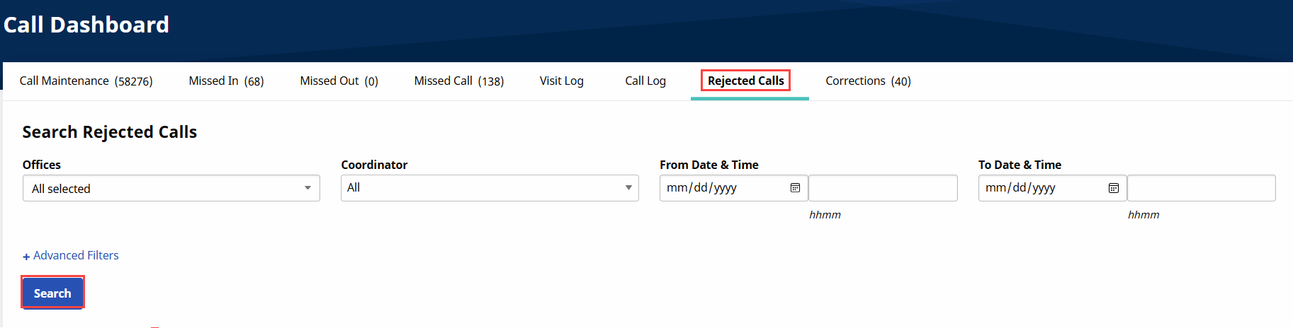Go to Visit > Call Dashboard select the Rejected Calls tab, and click Search.