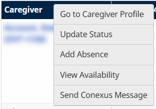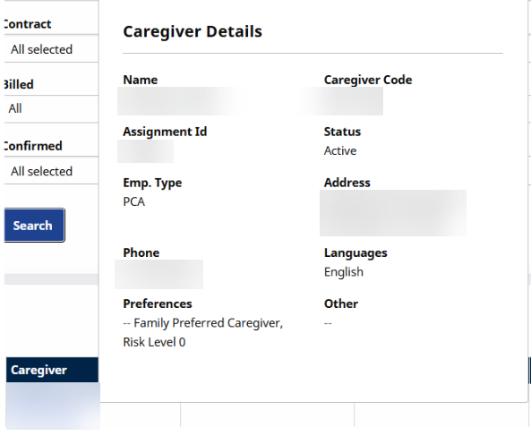 When searching for visits by Caregiver, hover the cursor over the Caregiver name in the left-most column to view a Caregiver’s information to include Name, Caregiver Code, Assignment ID, Status, Employment Type, Address, etc..