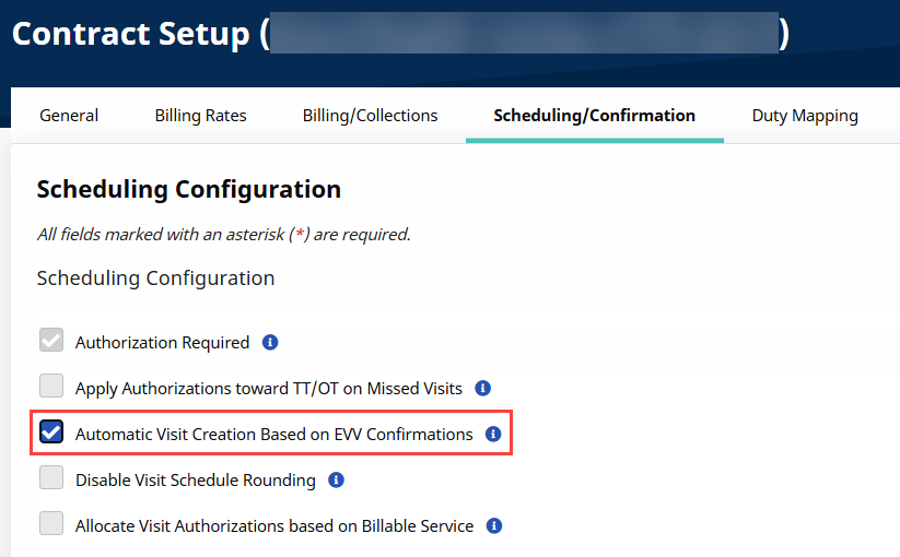 The Automatic Visit Creation Based on EVV Confirmation field must be selected on the Contract Setup page.
