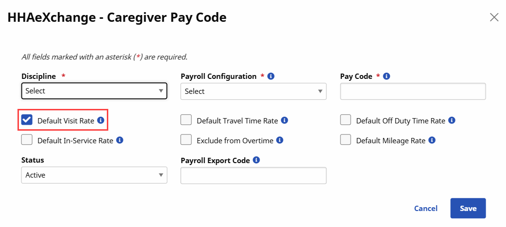 The Caregiver Pay Code window opens. Complete the required fields. Select the Default Visit Rate checkbox.