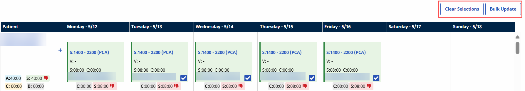 When one or more visits are selected, two buttons appear directly above the visit cells: Clear Selections and Bulk Update. Select Clear Selections to unselect all visits or Bulk Update to apply a schedule or confirmation change to all selected visits.