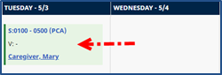 The Schedule Time fields open (1) and the Caregiver field turns blue (2). Make the desired edits to the visit and click Save.