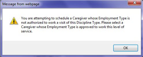 When scheduling a Caregiver to a visit, the system ensures the Caregiver’s Employment Type matches one of the Service Codes attached to the Patient. If there is an issue, an error message is generated.